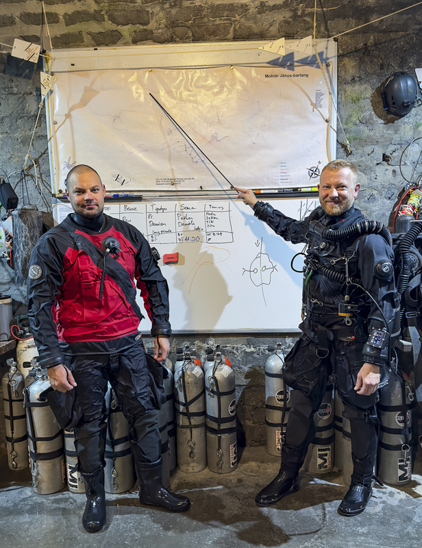 Schodzimy pod wodę. Zawsze pierwszy nurek jest testowy. Szczególnie dla osób, które jeszcze tu nie były i nie nurkowały jaskiniowo. Trasa jest raczej płytka i krótka, około 40 min oraz blisko wyjścia „na wszelki wypadek”. Kiedy już przewodnik przekona się, że wszystkie osoby w grupie mogą bezpiecznie i komfortowo zwiedzać labirynty jaskini Molnar, kolejne nurkowanie jest w znacznie bardziej widowiskowym miejscu.